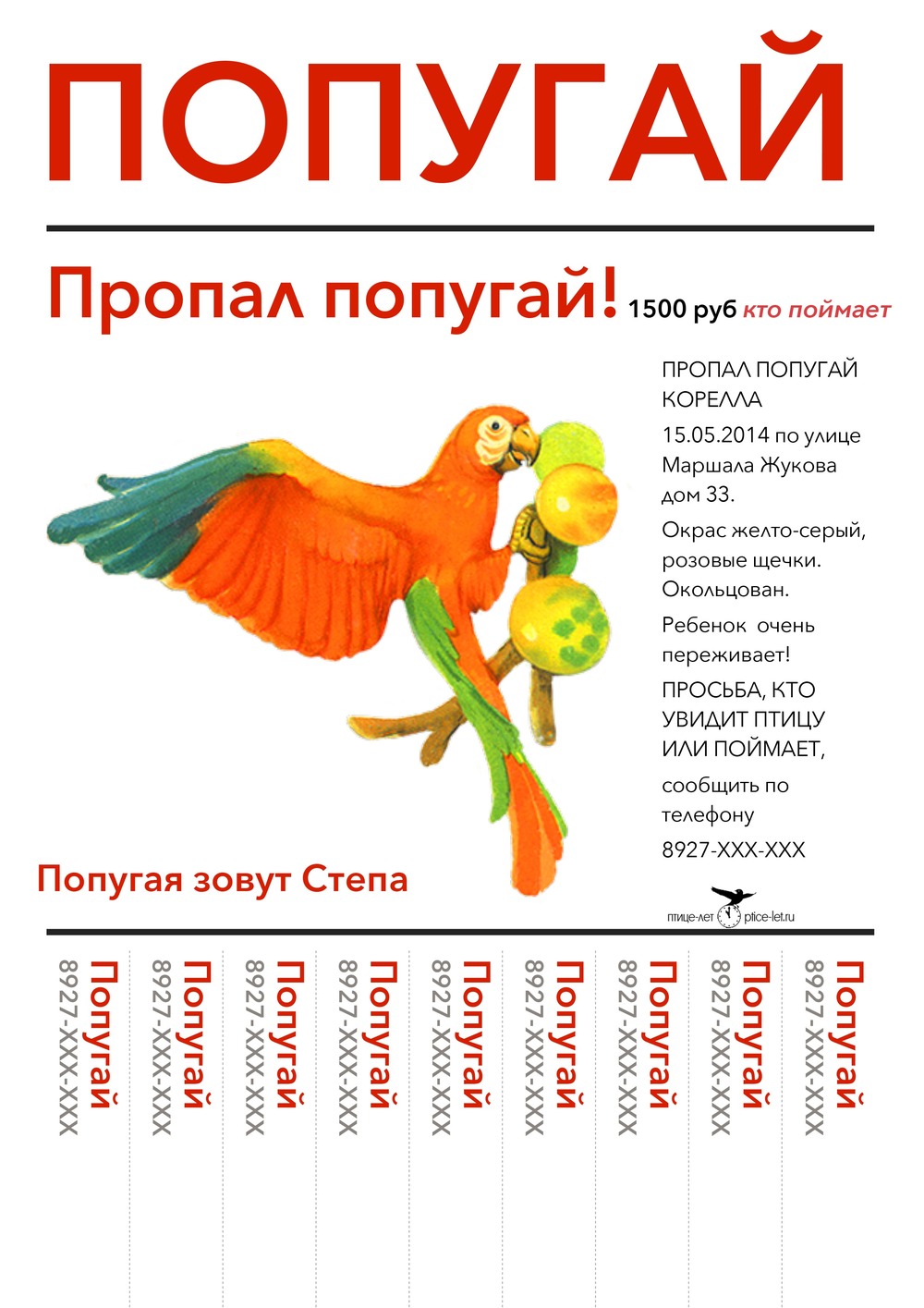 Вы можете попросить администрацию сайта напечатать для вас шаблон о пропаже попугая . Заявку оставляем в социальной сетиВКОНТАКТЕ группа ПОПУГАИ