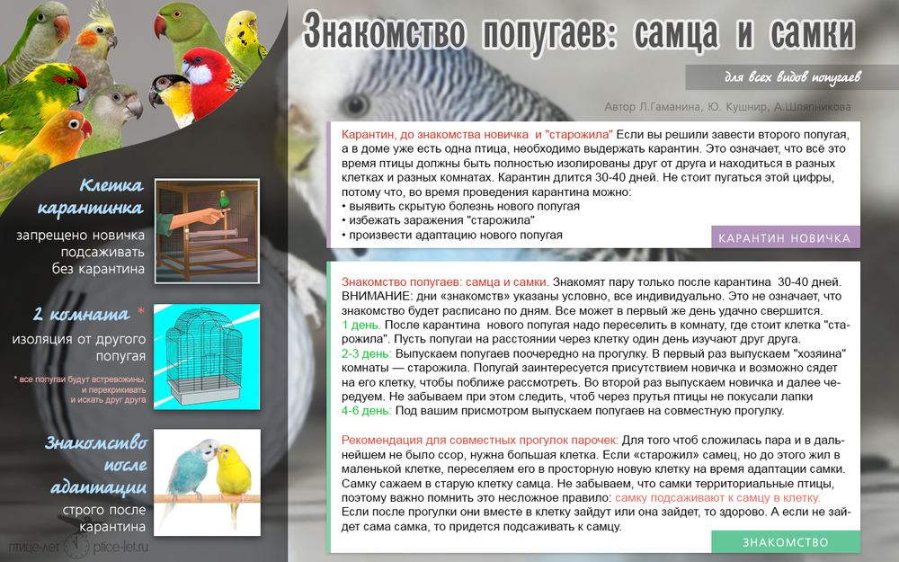Карантин, до знакомства новичка и "старожила" Если вы решили завести второго попугая, а в доме уже есть одна птица, необходимо выдержать карантин. Это означает, что всё это время птицы должны быть полностью изолированы друг от друга и находиться в разных клетках и разных комнатах. Карантин длится 30-40 дней. Не стоит пугаться этой цифры, потому что, во время проведения карантина можно: